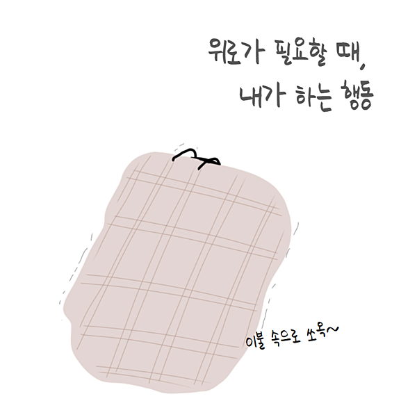 이불은 한여름에도 폭신하고도 두터운 것으로 고른다. 그리고 이불 네 면을 내 몸 쪽으로 말아 넣는다. 이불 상단 우측 모소리는 내 오른쪽 어깨 아래로, 상단 좌측 모소리는 내 왼쪽 어깨 아래로, 하단 우측 모소리는 내 오른발 아래로, 하단 좌측 모소리는 내 왼발 아래로. 이불의 사면을 내쪽으로 꽁꽁 잘 말아 넣는다. 바람 한 줌 들어오지 않도록. 그렇게 이불에 푹 쌓인다. 두껍고 폭신한 이불이 나를 감싸 안으며 지친 내 마음을 말랑하게 만들어준다. 따뜻하고 포근하다. 그러다 마음이 조금 더 가라앉으면 얼굴까지 이불 속에 파묻는다. 이불이 조금 들썩거려도, 이불 안이 조금 습해져도, 내 온몸을 빈틈없이 감싸주는 이불이 있어서 따스한 위로를 받는다.