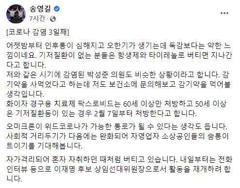 송영길 "코로나19 감염 3일째…오미크론, 독감보다는 약한 느낌"