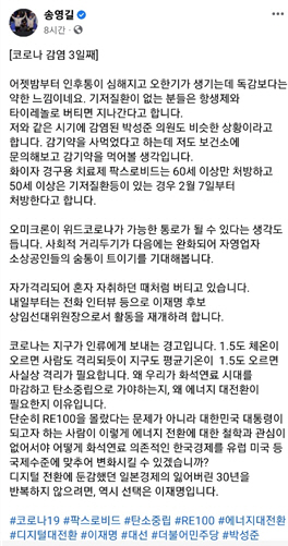 코로나 확진 송영길 "오미크론, 독감보다 약해…위드코로나 통로될 듯"
