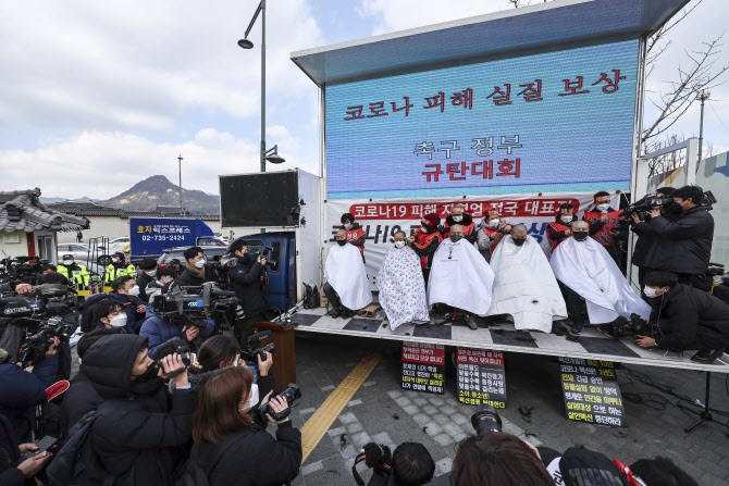 또 삭발한 자영업자들 "더는 못 참겠다…21일부터 24시간 영업"