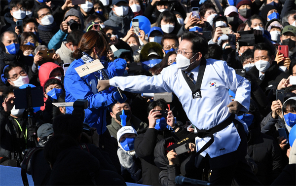 태권도복 입고 '코로나 위기' 송판 격파한 이재명