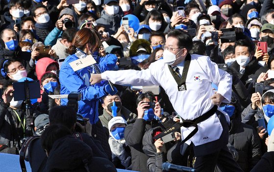 "코로나 위기 격파" 이재명, 이번엔 도복 입고 '송판 주먹질'