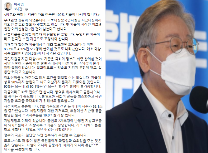 이재명 "재난지원금 지금이라도 전국민 100% 지급해야"