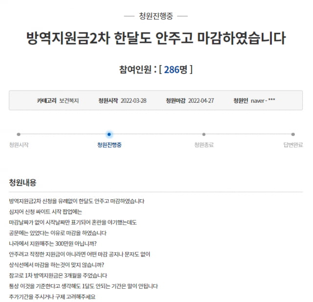 "2차 방역지원금 한 달도 안돼 마감…신청 못했다" 국민청원