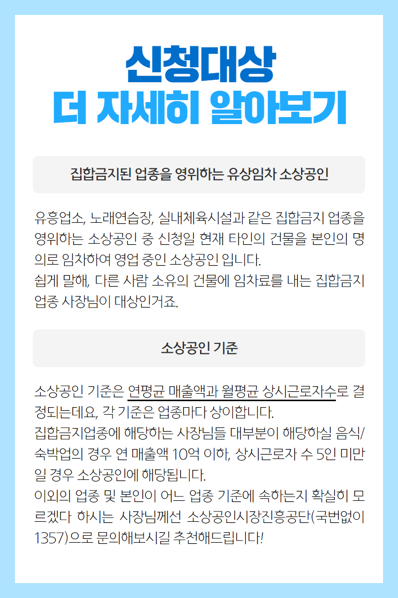 특히 노래방, 실내체육관 등 집합금지업종에 해당하는 사장님들께선 더욱 상심이 크실 거에요.