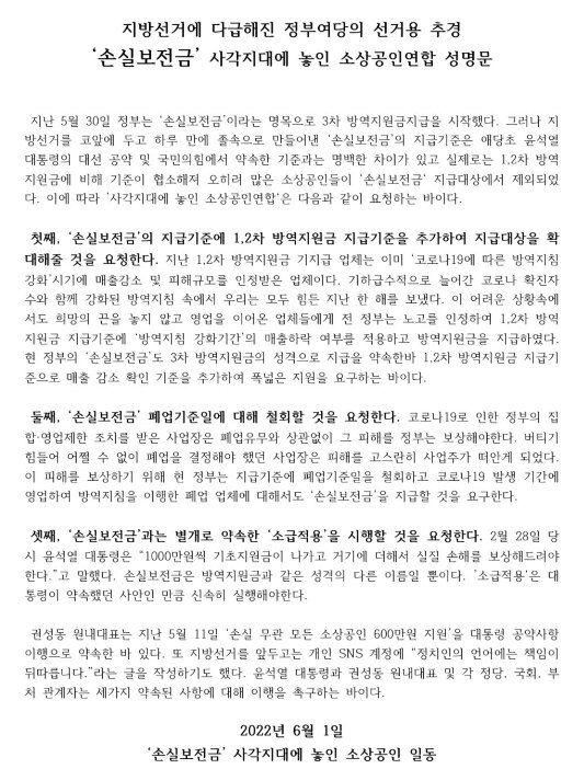 “억울한 사람 없게 하라”… 손실보전금 못 받은 소상공인들 반발 성명