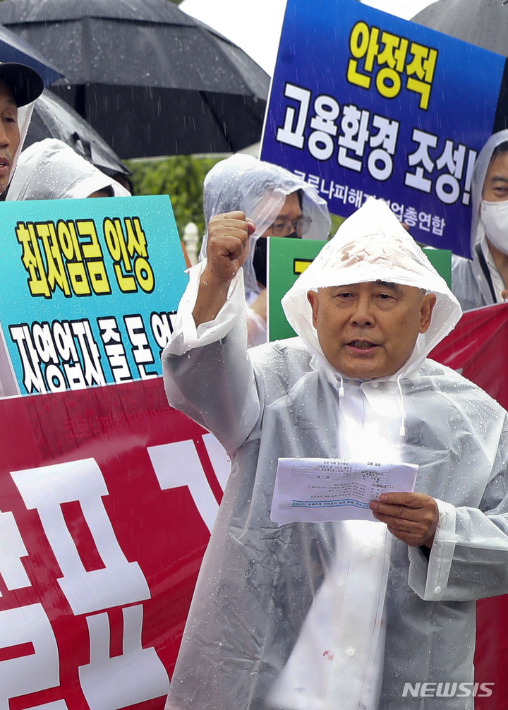 최저임금 관련 규탄 구호 외치는 코로나피해자영업총연합