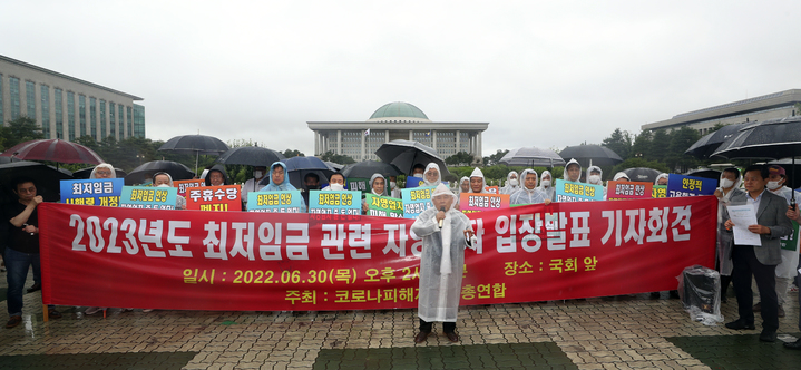 2023년도 최저임금 관련 입장 발표 기자회견하는 자영업자들
