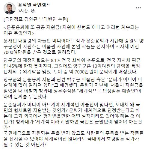 尹캠프 "문준용, 세계적 예술인이 왜 국민 혈세로만 지원받나"