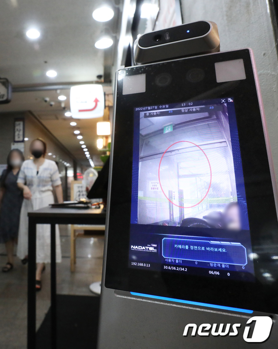 음식점 밀집지역에 설치된 전자식 체온계