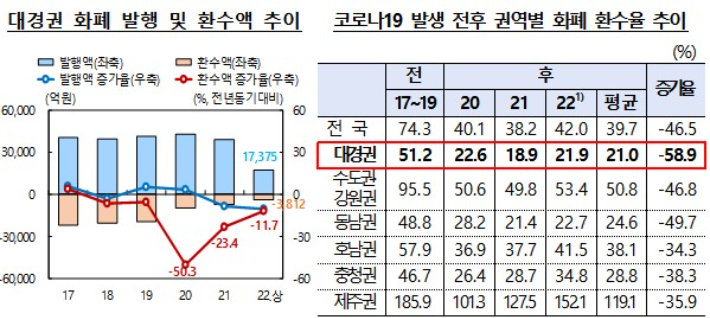 코로나19 이후 대구·경북 환수율…고액권↓·주화↑