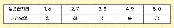 방문 신청은 5부제로 운영되는데요, 9월 19일부터 아래 표와 같이 생년끝자리에 따른 신청요일에 접수가 가능합니다.