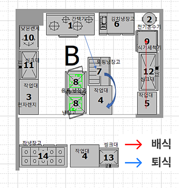 😥 체크 포인트 어머니 혼자 담당하는 주방! 조리/배식, 퇴식/설거지에 있어 동선이 넓음. 업무 효율성 저하 🔎 배식 구조: 1번에서 조리 → 8번 냉장고에서 재료 토핑 → 3번 배식 🔎 퇴식 구조: 3번 퇴식 그릇 놓기 → 12번 초벌 설거지 → 9번 식기세척기 사용 |