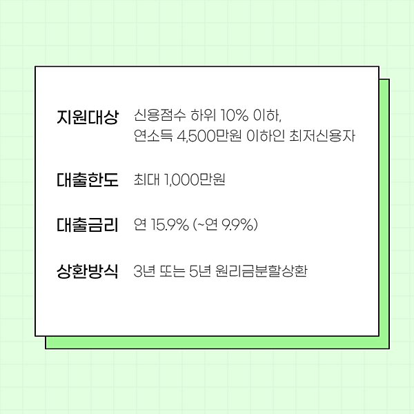 최저신용자를 위한 정부의 서민금융대출은 햇살론15 등 기존에도 존재했었는데요, 기존 서민금융대출은 신용점수 하위 20% 이하인 자를 대상으로 했기 때문에 그보다 더 어려운 사정의 신용점수 하위 10% 이하이신 분들은 정부 금융대출 이용이 불가능했어요.