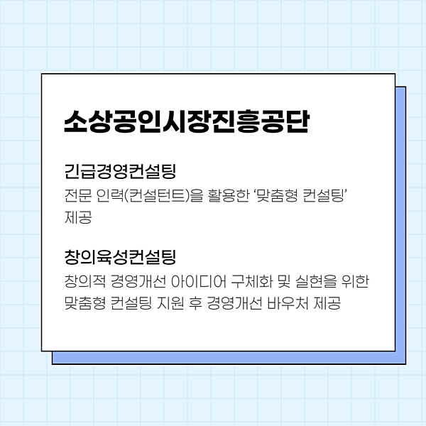 소상공인시장진흥공단에서는 긴급경영컨설팅과 창의육성컨설팅, 무료법률컨설팅을 지원합니다.