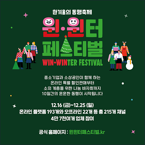 12월 16일 금요일부터 중소벤처기업부가 주최하는 한겨울의 동행축제 윈·윈터 페스티벌이 열린다고 합니다!