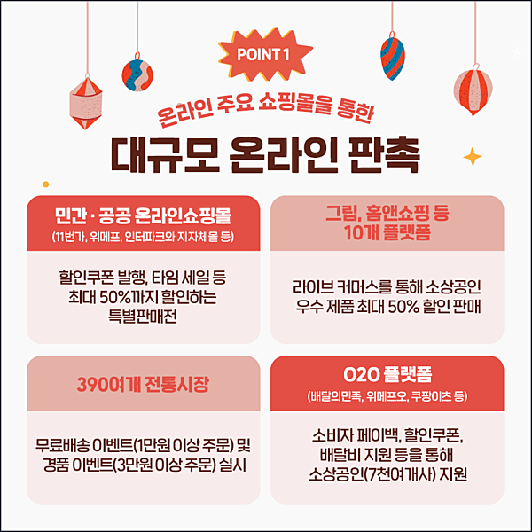| 📌민간·공공 온라인 쇼핑몰 11번가, 위메프, 인터파크와 지자체 쇼핑몰 등에서 할인쿠폰 발행과 타임세일 등을 통해 최대 50%까지 할인하는 특별판매전을 열어요. 📌라이브커머스 그립, 홈앤쇼핑 등 10개 플랫폼에서 라이브커머스를 통해 소상공인 우수 제품을 최대 50% 할인 판매합니다. 📌전통시장 390여개 전통시장에서 무료배송 이벤트 및 경품 이벤트를 실시해요. 📌O2O플랫폼 배달의민족, 위메프오, 쿠팡이츠와 같은 O2O 플랫폼에서 소비자 페이백, 할인쿠폰, 배달비 지원 등을 통해 소상공인을 지원 |