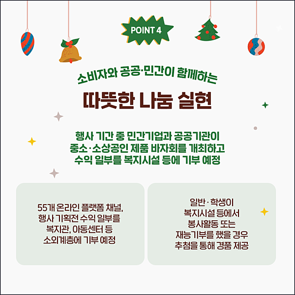 | 📌행사기간 중 민간기업과 공공기관이 중소·소상공인 제품 바자회를 개최하고 수익 일부를 복지시설에 기부할 예정입니다. |