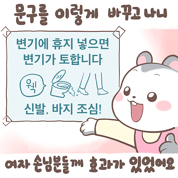 | ✏️ 사장님의 사연 아까 어떤 사장님이 올리신 글에 깊은 공감과 분노를 느끼며 작성합니다. 사장님들 우리 화장실 센스있는 멘트 재능기부 해봐요. 화장실 멘트가 참 중요한 것 같아요. 한 번은 손님들이 자꾸 변기에 휴지를 버려서 화장실에 큰 사고가 날 뻔했었어요. 그래서 ‘변기에 휴지 넣으면 변기가 토합니다. 신발 바지 오물 조심!!’라고 멘트를 적어 붙여놓았더니 여자 손님들이 변기에 휴지를 전혀 버리지 않더라고요! 🧻 희망을 품고 남자 화장실에는 ‘백발백중 당신의 능력을 보여주세요.’라고 써 붙였더니 이게 웬걸... “백발백중했는데 상품 없나~” 하거나, ”에잇 몰라!!” 하고 벽에 다 튀게 용변을 보시네요… ㅠㅠ 좋은 아이디어 없을까요? 센스있는 멘트로 힐링하고 싶어요. 🤧