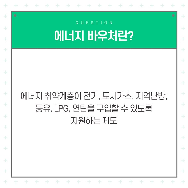 | 🔋 에너지 바우처 : 에너지 취약계층을 대상으로 전기, 도시가스, 지역난방, 등유, LPG, 연탄을 마련할 수 있도록 도움을 주는 지원 제도 |