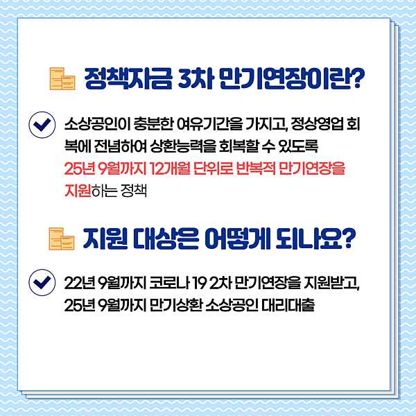 📌 지원대상 : ‘22년 9월까지 코로나19 2차 만기연장을 지원받고 ’25년 9월까지 만기상환 소상공인 대리대출