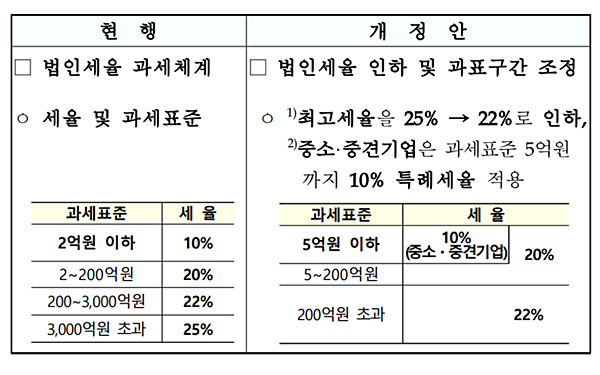 법인세 세율은 22년 귀속분까지 2억이하 10%가 적용되겠으나, 23년 1월 1일 이후 개시하는 사업연도부터는 중소·중견기업의 경우 5억이하까지 10% 세율이 적용되어 법인세 부담이 경감되겠습니다.