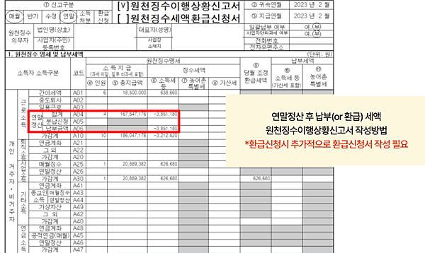 | 연말정산 후 납부 (or 환급) 세액 원천징수이행상황신고서 작성방법 환급신청시 추가적으로 환급신청 작성이 필요합니다. ![]() |