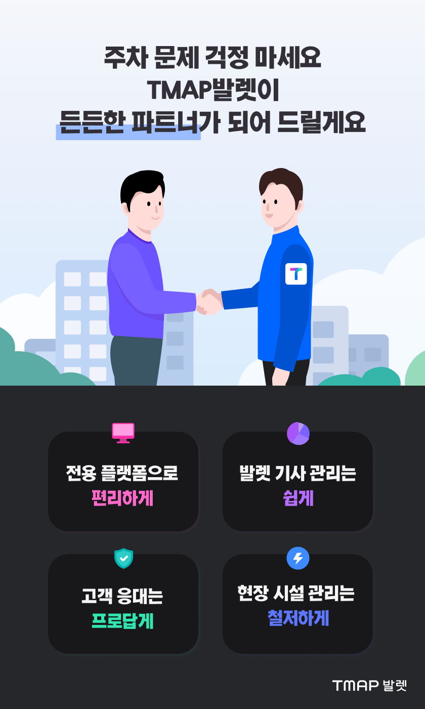 발렛 부스 설치부터 주차장 운영, 사고 처리까지 사장님이 신경 쓰실 부분이 없도록 TMAP발렛에서 모두 챙겨드려요!