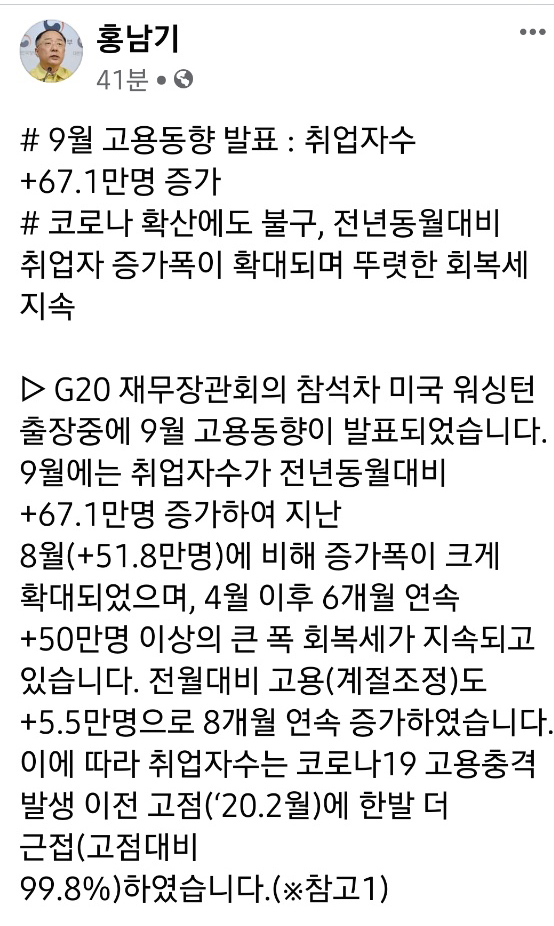 [속보]홍남기 "취업자 수 코로나 충격 이전의 99.8% 회복"
