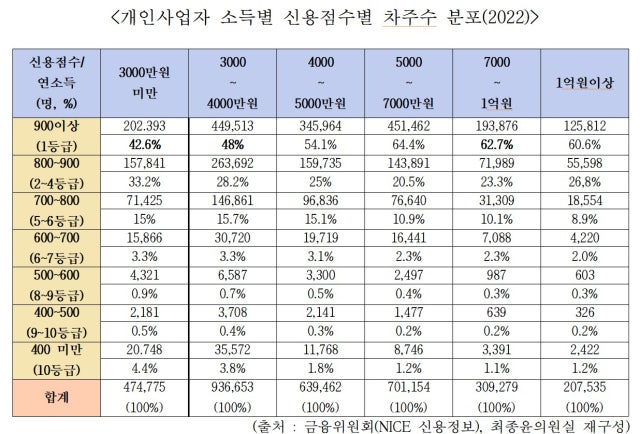 자영업자 신용점수 양극화 심화…소득 적을수록 신용점수 낮아