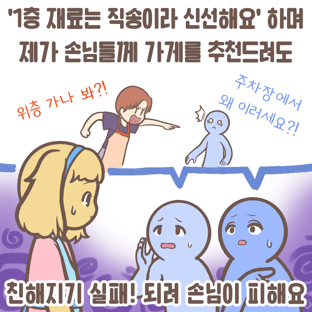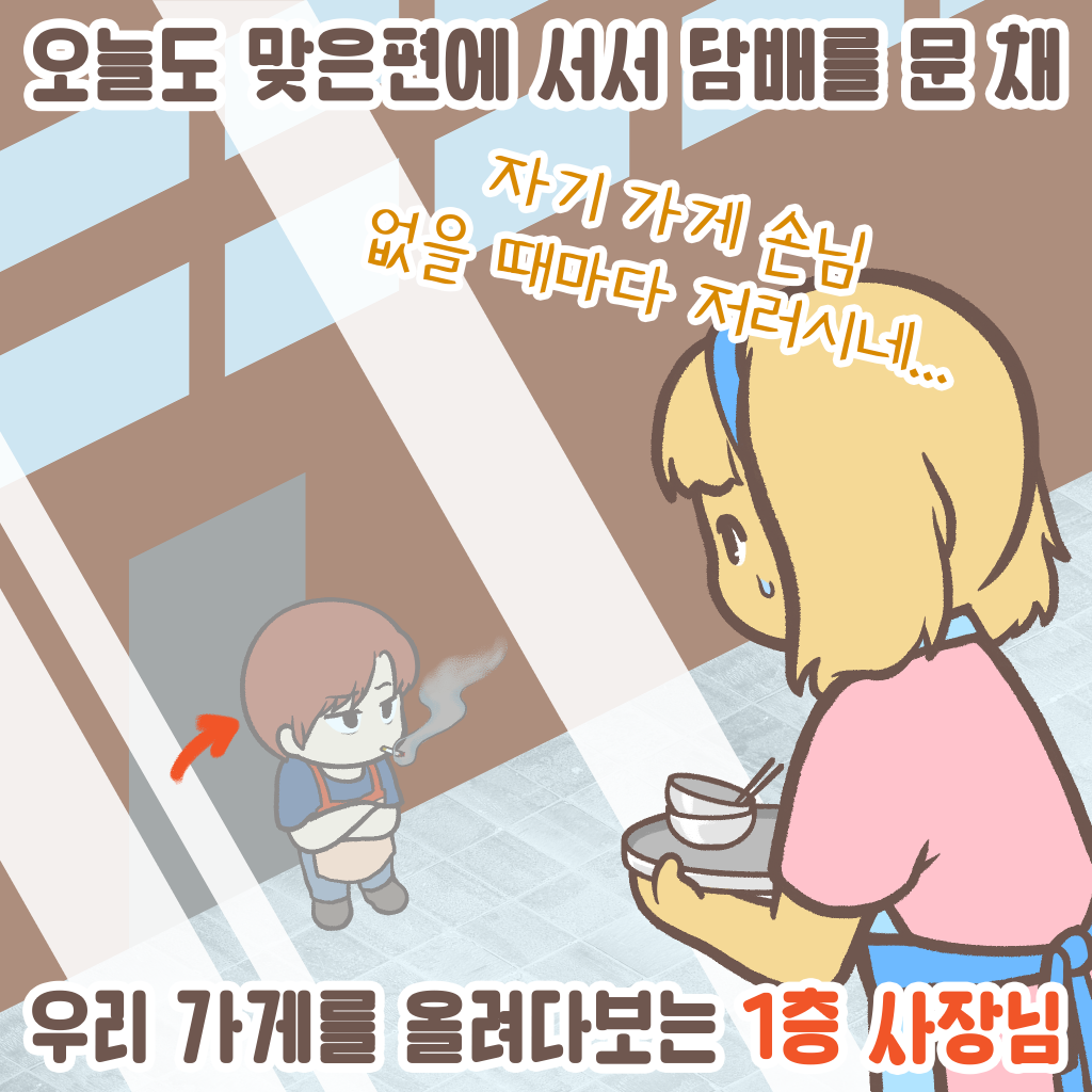 ✏️ 사장님_포*******새의 사연 공사 때부터 사사건건 팀마다 싸움 안한 사람이 없었던 1층 사장님. 일부러 공사하는 사람들이 공사기간동안 그 집에서 식사도 했다는데 음식물 쓰레기까지 비닐채로 우리 쓰레기통에 넣기 일쑤! 품목이 완전 다른데도 불구하고 담배를 피워도 우리 주방 아래서 피고 면접 보러 온 알바가 가게 입구 물어본다고 화를 내네요. 전 그 집이 여수에서 직송이니 신선하고 맛있을 거라고 안내도 해주는데 어찌하면 좋을까요? 우리 가게에 오는 손님들한테도 나를 비방하니 스트레스 많이 받네요. 😵