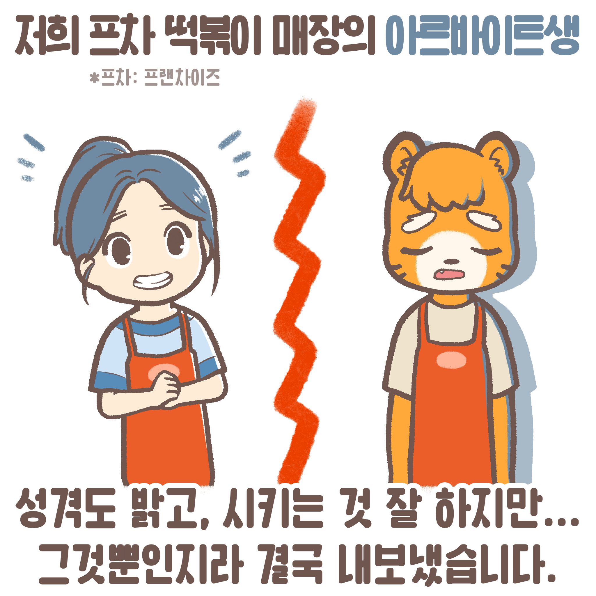 ✏️ 맨날****크 님의 사연 프차 떡볶이 매장입니다. 4개월차 알바를 내보냈습니다.시키는 건 잘합니다. 성격도 좋고 밝고. 그런데 그게 다입니다. 시키는 것만 잘합니다. 여태 알바 쓰면서 4개월차 접어들면 모두 시급 올려줬습니다. 하지만 이번에는 안올려줬습니다. 다른 알바들은 6시부터 10시까지인데, 이 친구는 학교 늦게 마친다고 6시 30분으로 출근 조정해줬습니다. 3시간 30분 근무에도 쉬는 시간 30분, 근로계약서에 없는 식사까지 제공했습니다. 너무 잘해줬나... 어제 폭발한 건, 그저께 일을 하나도 안 하고 갔더라구요. 홀청소(바닥 닦기), 떡 소분, 소스 소분 하나도 안되어 있고 냉장고 텅텅 비었고 음쓰는 음쓰통에 그대로, 행주들은 싱크에 그대로, 떡볶이를 두 개나 잘 못 만들어서 폐기, 실링 용기 잘 못 실링해서 용기 두 개 폐기. 하루 일하러 오면 로스가 시급의 1.5배... 어제는 6시 40분 한창 바쁜 시간 지각했는데 피크 다 쳐내고보니 조리를 신고 왔더라고요. 퇴근하는 애 불러서 한 번 이야기 좀 해보자 하니 펑펑 울면서 죄송하다며 관둔답니다. |