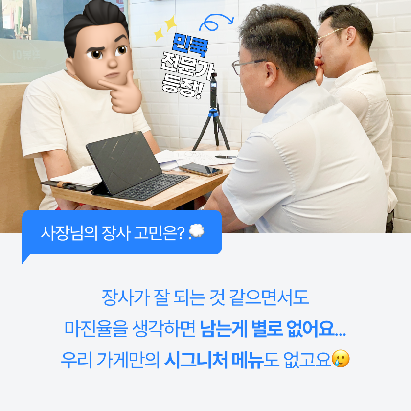 평소 장사를 하면서 누군가 나에게 알려줬으면 생각해 본 적 없으신가요? 사장님의 고민과 궁금증을 민쿡 전문가에게 물어보세요.
