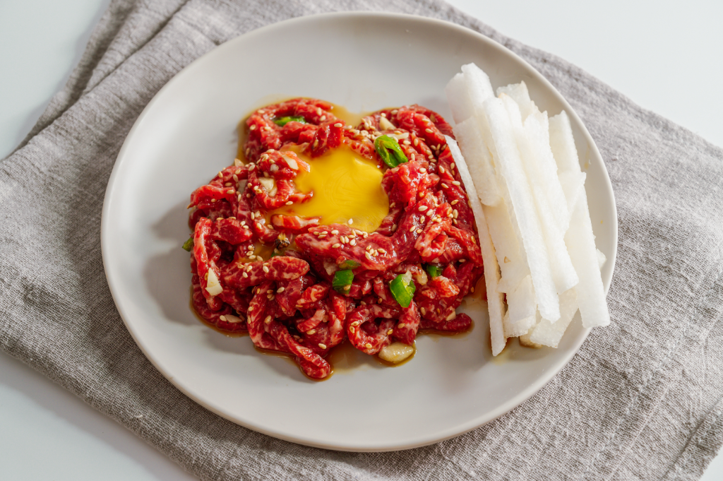 사실 이 육회 상품력은 그냥 무난하다. 그럼에도 불구하고 이 육회가 많이 팔리는 것은 생육회를 진한 참기름장에 찍어서 먹으면 좀 미진한 식감과 풍미의 맛을 상당히 보완하고 있다. 참기름이 소스의 구실을 하는 것이다.