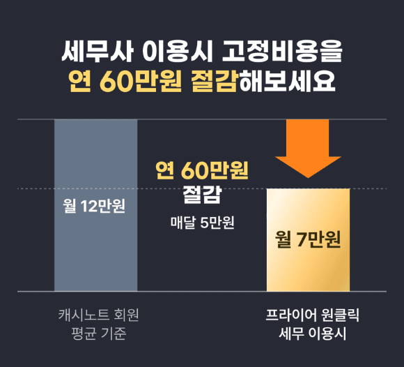 프라이어 원클릭 세무 서비스를 이용하시면 월 평균 12만 원 지출 사장님 기준 연 60만 원까지 세무 비용을 아끼실 수 있습니다.