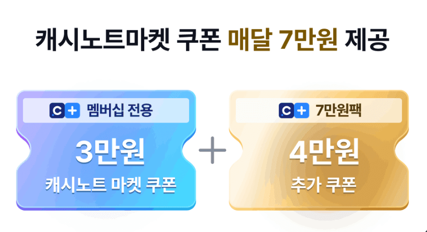 캐시노트플러스 멤버십 7만원 팩에는 기존 캐시노트플러스 3만원 쿠폰팩 + 2만원 쿠폰 2장이 (10만원 이상 구매 시)추가 발급됩니다.