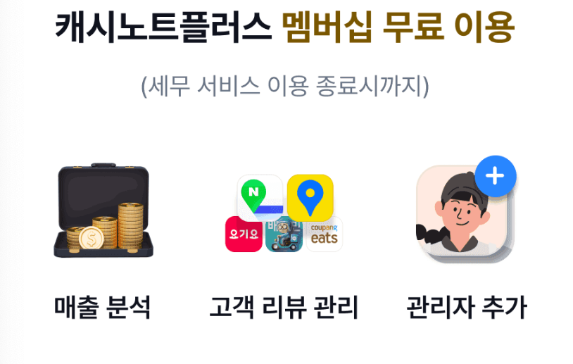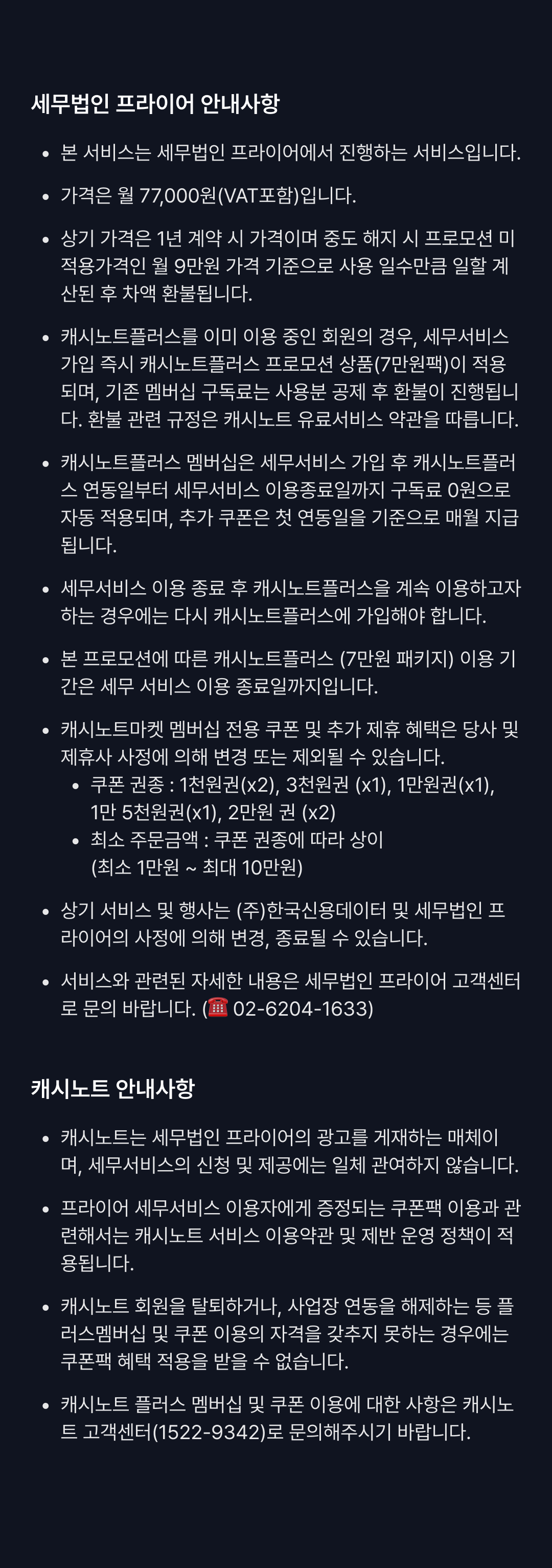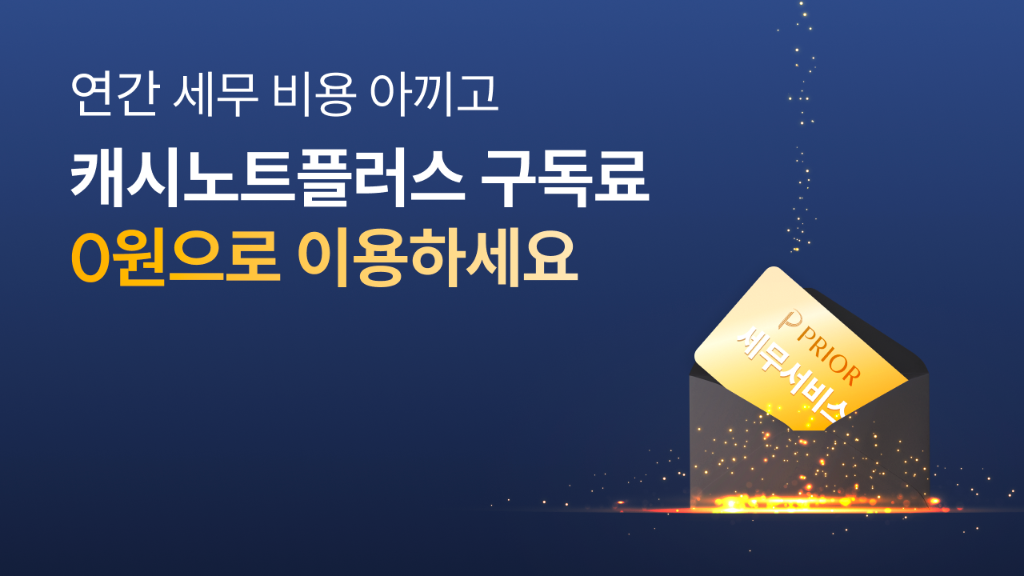 이미 캐시노트플러스 또는 고급형을 이용하고 계신 분들의 경우 세무 서비스 가입 즉시 캐시노트플러스 7만원 팩이 적용됩니다.