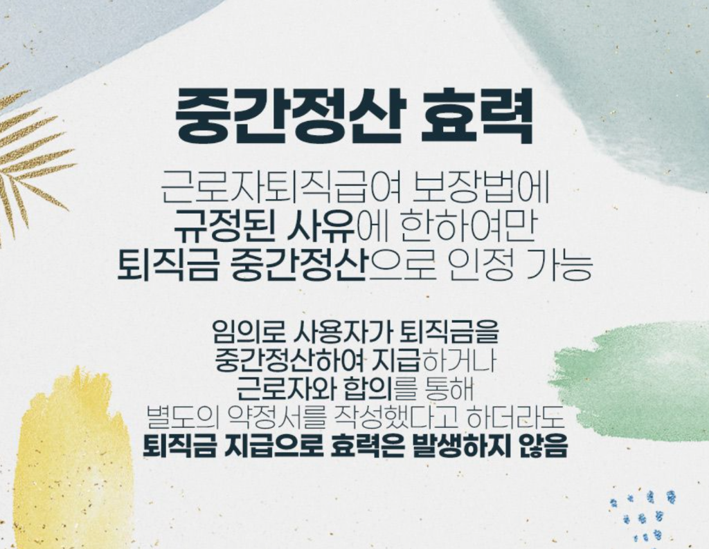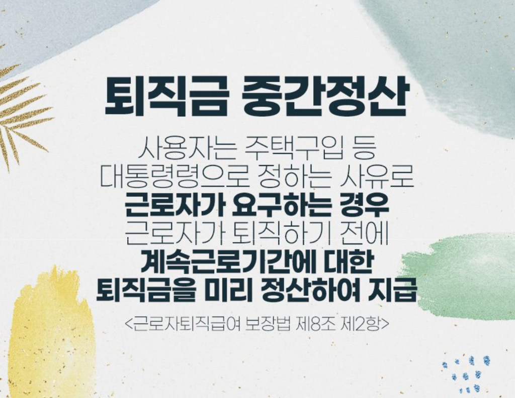 그러나 특정 사유가 발생한 경우에는 재직 중에도 퇴직급여를 중간정산 할 수 있도록 하고 있는데요, 이번 시간에는 퇴직금 중간정산제도에 대해 살펴볼게요!