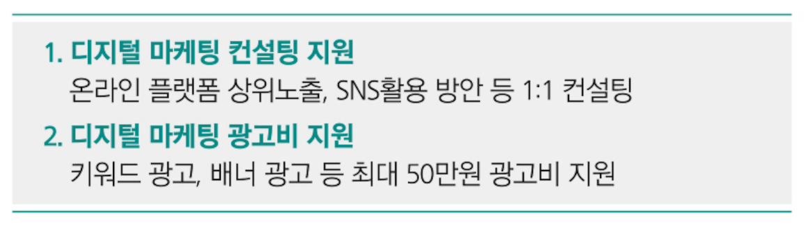 금액 | 온라인 광고비 최대 50만원(VAT포함) 지원 + 디지털 마케팅 컨설팅 2회 ![]() |
