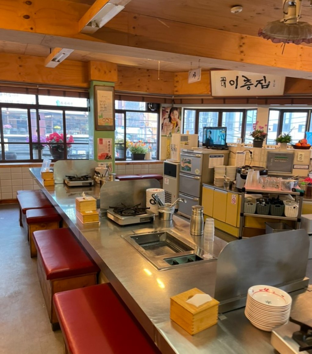 <교대이층집>의 경우 디귿 자 모양의 대형 테이블에 내장형 불판을 두고 전부 일렬로 앉아 고기를 구워 먹는 독특한 형태를 이루고 있습니다. 이런 생생한 인테리어의 핵심은 김슬기 대표의 집요한 벤치마킹과 상상력에 있는데, 그와 벤치마킹을 주로 같이 다녔다는 한 식당 사장님은 이런 이야길 전했습니다.