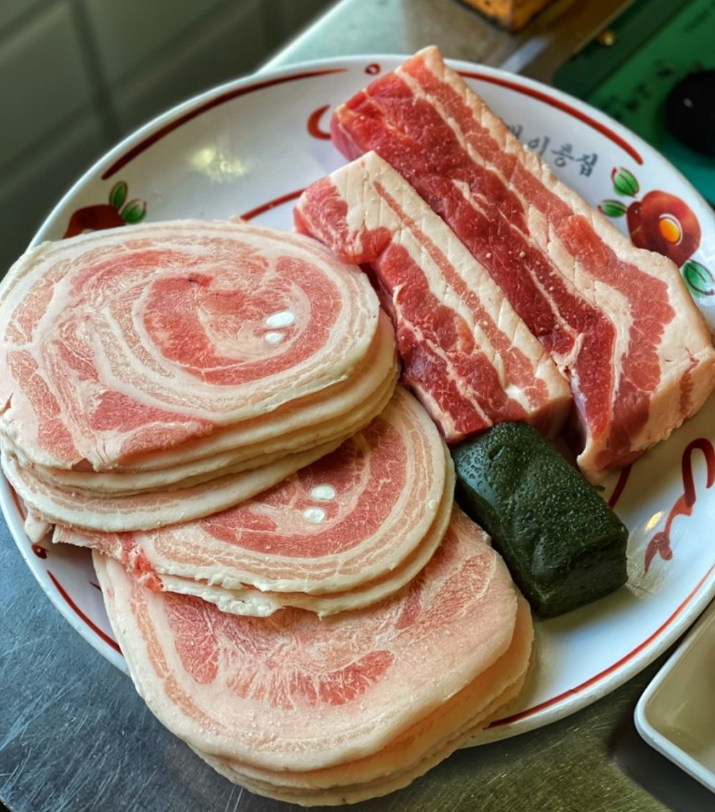 삼겹살을 동그랗게 만 상태로 급랭한 후 단면을 슬라이스해 제공하는 일명 꽃삼겹살. 같은 삼겹살이라도 새롭게 차별화한 노력이 보인다. | |