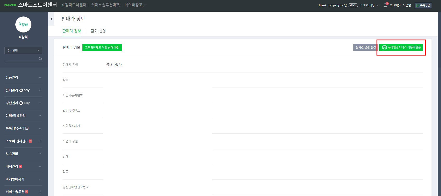 스마트 스토어를 만들고 나면 '구매안전서비스 이용 확인증'을 발급 받을 수 있습니다. 스마트 스토어 센터에 접속 후 왼쪽 메뉴 중 '판매자 정보'에서 '구매안전서비스 이용 확인증'을 발급받을 수 있습니다. |