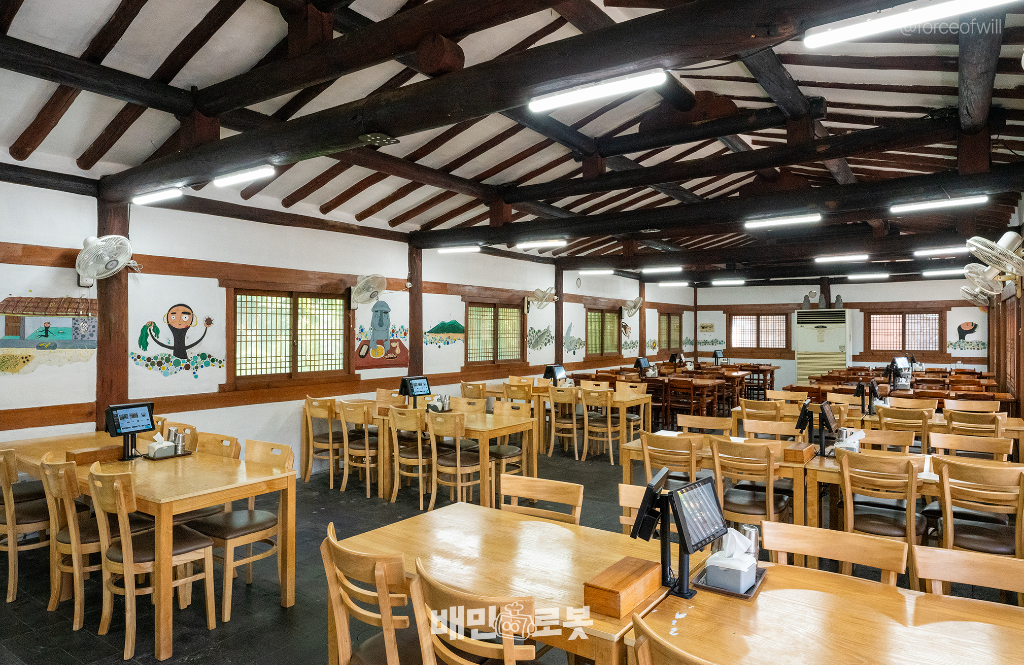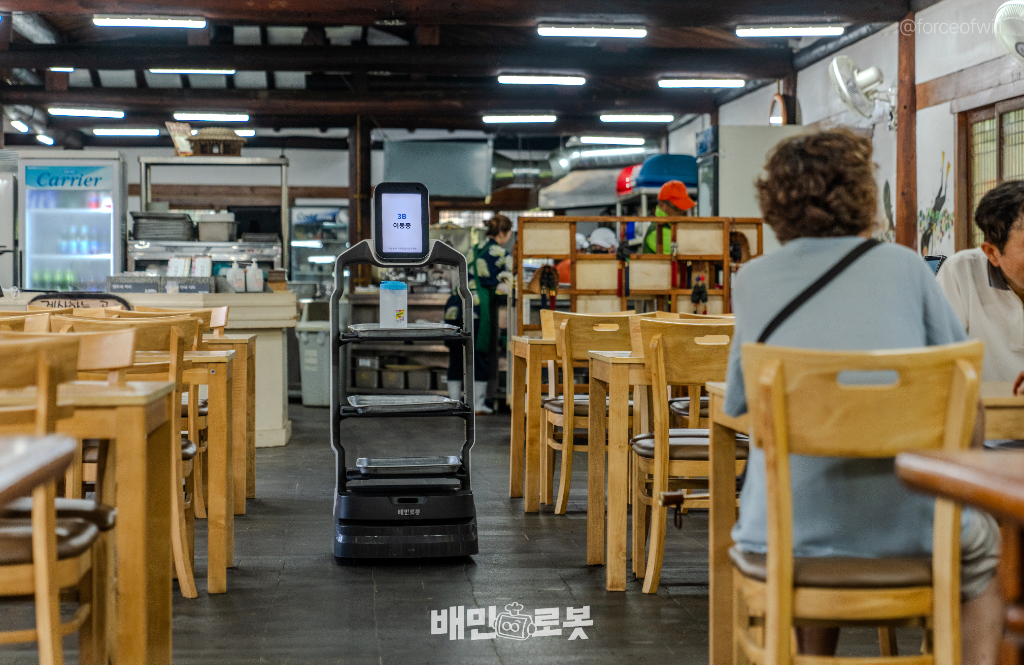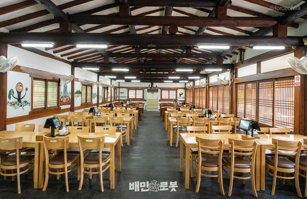 외관에서도 확인할 수 있듯이 식당이 일직선으로 뻗어있는 형태입니다. 통로가 긴 형태의 매장은 서빙할 때 이동 거리가 길 수 밖에 없는데요. 관광객이 몰려도 음식을 빠르게 전달하기 위해 배민 서빙로봇을 렌탈했다고 합니다.