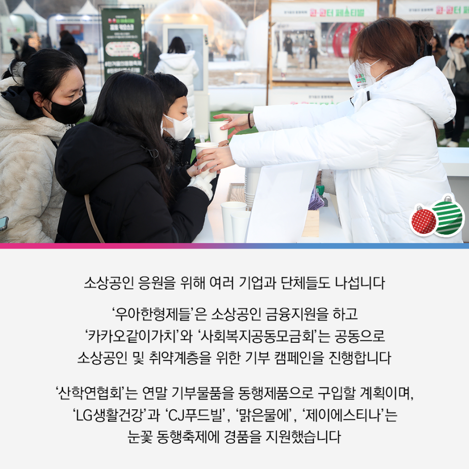 금융 지원 및 경품 지원 소상고인 금융 지원과 소상공인 및 취약계층을 위한 기부 캠페인, 동행제품 구매 및 경품 지원 등 다양한 기업과 단체들의 지원 |