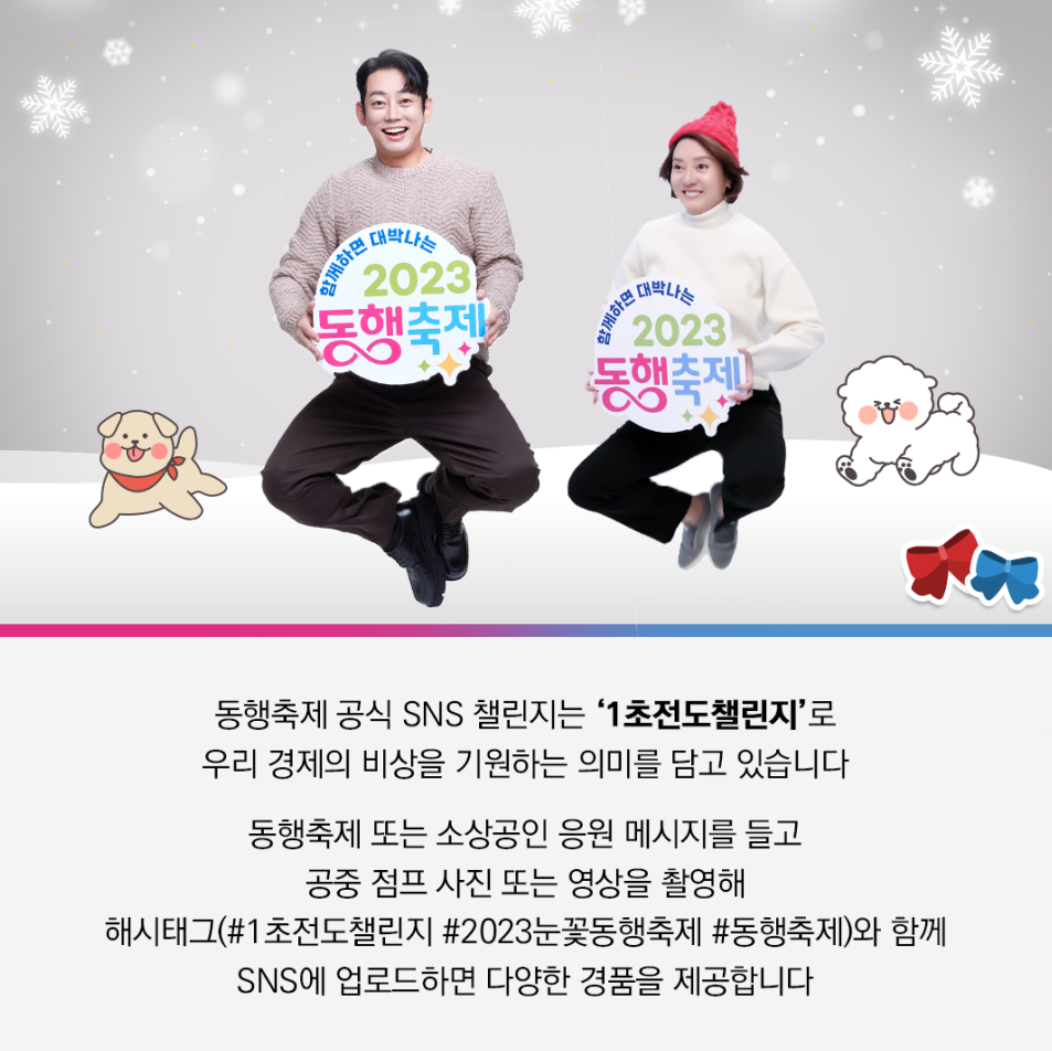 1초전도챌린지 동행축제 또는 소상공인 응원 메시지를 들고 공중 점프 사진 또는 영상으로 촬영 후 해시태그(##1초전도도전잇기(챌린지) #2023눈꽃동행축제 #동행축제)와 함께 SNS에 업로드 해주세요. |