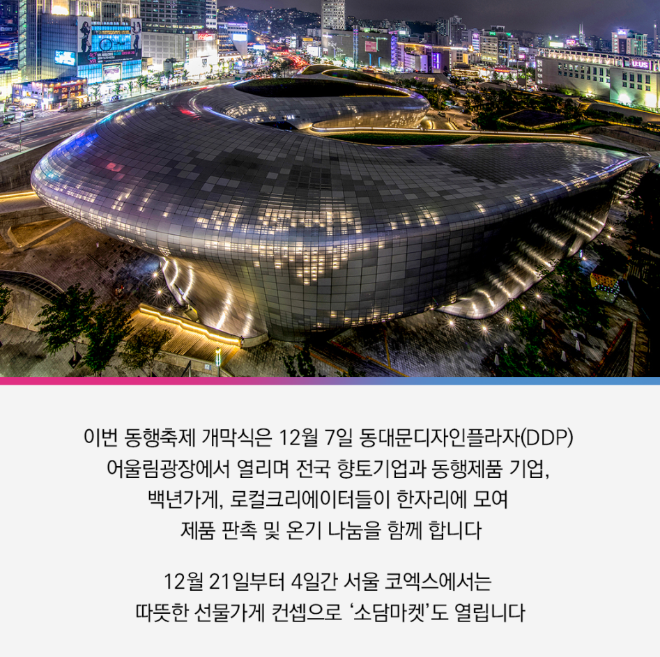 개막식(특별행사) 12.7(목)~12.9(토) 3일간 동대문디자인플라자 어울림광장에서 개막식, 오프라인 행사, 판촉전 등 진행 |