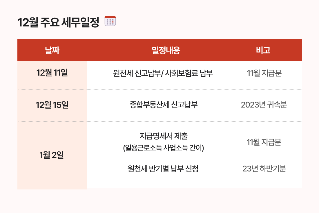 연말 분위기가 물씬 나는 12월입니다. 한 해의 마무리 잘 하시길 바라며 12월 주요 세무 일정 알려드릴게요!