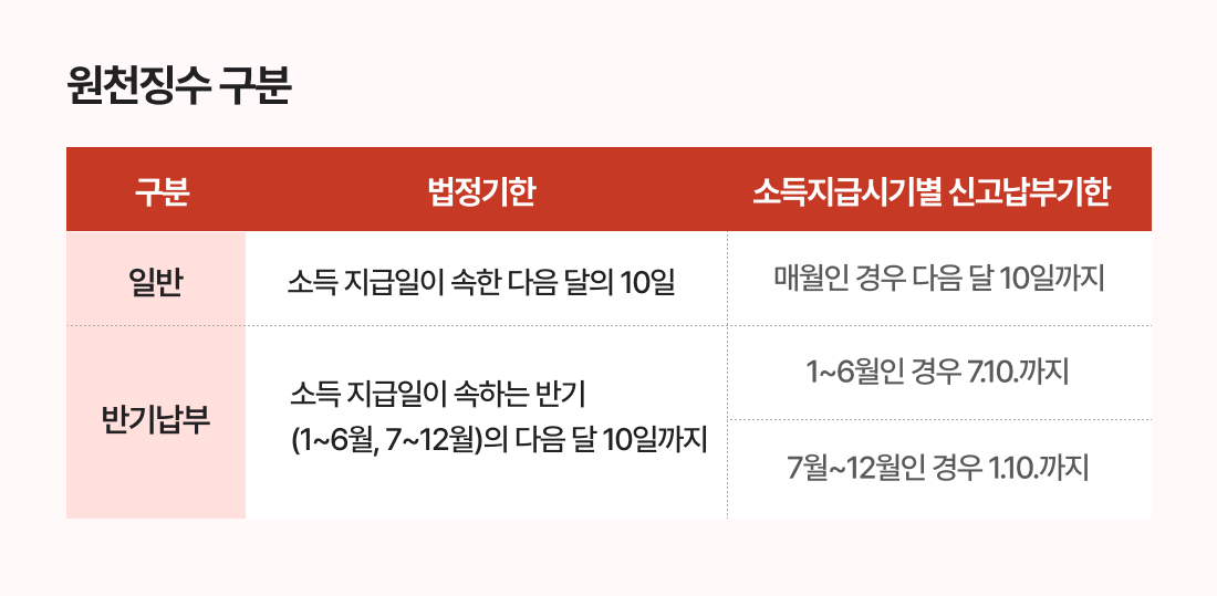 또한 반기별 신고・납부 대상 사업자는 신청 후 반기별 신고・납부가 가능합니다. 1월~6월가지 소득지급이 이루어졌다면 7월 10일까지, 7월~12월까지 소득지급이 이루어졌다면 1월 10일까지 신고・납부가 가능합니다.