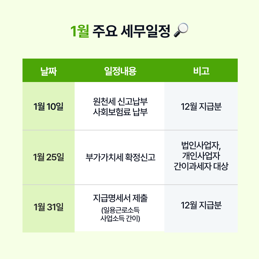 또한, 1월 10일까지 4대보험도 납부되어야 하므로 연체되지 않도록 주의해 주시기를 바랍니다.