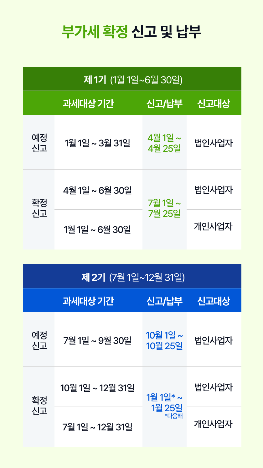법인사업자의 경우 10월~12월, 개인사업자의 경우 7월~12월을 과세대상 기간으로 하여 1월 25일까지 신고해야 합니다.